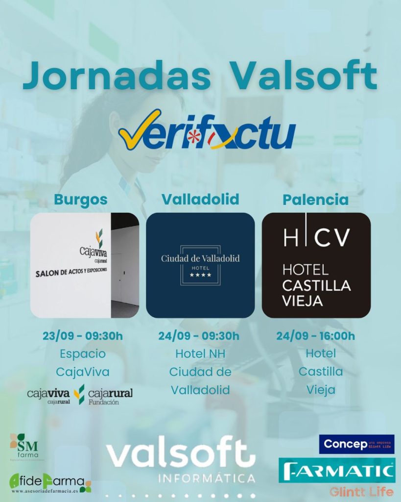 Hoy hemos estado en Burgos de la mano de Valsoft Informática . Nuestros representantes Juan Durán de AfideFarma y Sergio Martín de Smfarma, nos han hablado sobre Verifactu como herramienta de control de la Agencia Tributaria y nos han dado claves para no cometer errores en la venta de una farmacia. Gracias Valsoft por contar con nosotros y con Cajaviva Caja Rural y Concep by Glintt, para participar en estas charlas.